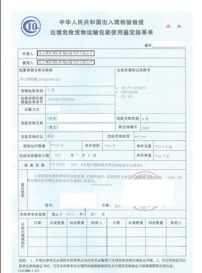 3. 有了產(chǎn)品報告,有了包裝的報告,就可以申請出證了,這個證就是出口報關需要的危包證。 示例如下