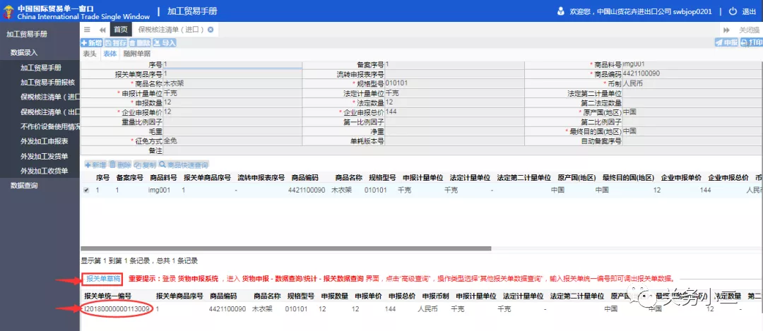 注意,通過z統(tǒng)一編號導(dǎo)入的報(bào)關(guān)單,手冊項(xiàng)號需要重新錄入,由于進(jìn)口核注清單主管海關(guān)輸入的是沙灣海關(guān),導(dǎo)致報(bào)關(guān)單中的申報(bào)現(xiàn)場是沙灣海關(guān),必須手動改為吳中綜保。