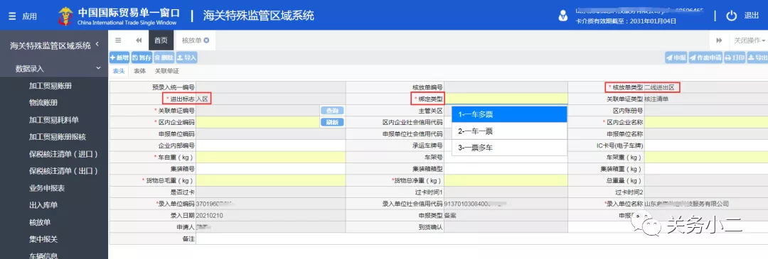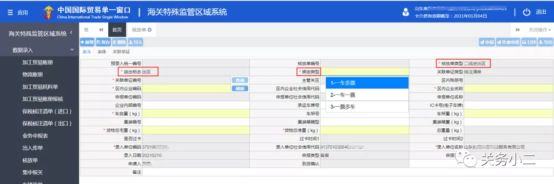 核放單類型:二線進(jìn)出區(qū)