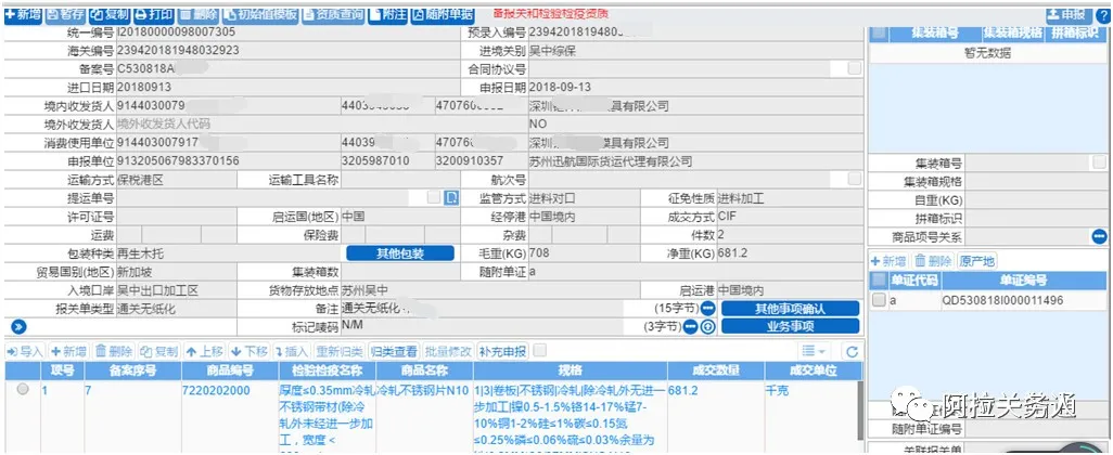 1、報(bào)關(guān)標(biāo)志:報(bào)關(guān),報(bào)關(guān)類型:關(guān)聯(lián)報(bào)關(guān),報(bào)關(guān)單類型:進(jìn)口報(bào)關(guān)單。