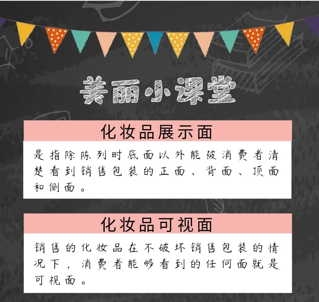 凈含量應標注在化妝品銷售包裝的展示面上,如果因化妝品銷售包裝的形狀和/或體積的原因,無法標注在銷售包裝的展示面位置上時,可以標注在其可視面上。