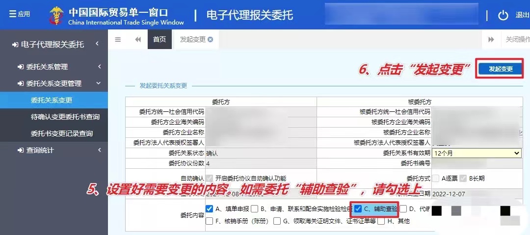 (4)在發(fā)起變更界面中,如需委托輔助查驗,請勾選輔助查驗選項,設(shè)置好需要變更的內(nèi)容,點擊發(fā)起變更。